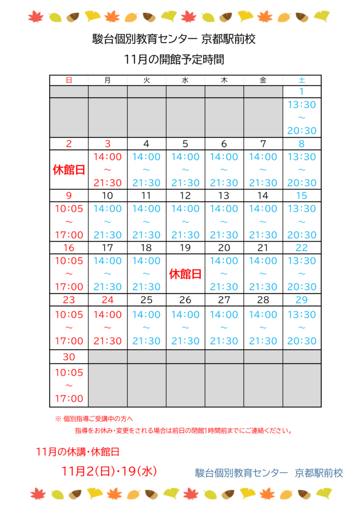 11月の開館日 2025 10/23 京都駅前校 高校受験 個別指導 大学受験 □11/2(日)、11/19(水)は休館となります。お電話・受付対応もございませんのでご注意願います。□11/3(月)と11/24(月)は職実ですが、平日と同じ開館時間となります。 京都駅前校 高校受験 個別指導 大学受験 10月の開館日程 関連記事 10月の開館日程 2025年9月26日 自習のススメ 2025年7月12日 ☆2025年度 大学合格実績☆ 2025年1月6日 駿台の個別指導を体験してみませんか? 2024年11月9日 2024年度 駿台個別教育センター 京都駅前校 合格実績 2024年3月23日 京都駅前校のご紹介 2023年12月8日 京都駅前校ってどんなところにあるの? 2023年12月8日 京都駅前校 2023年合格速報 2023年6月7日