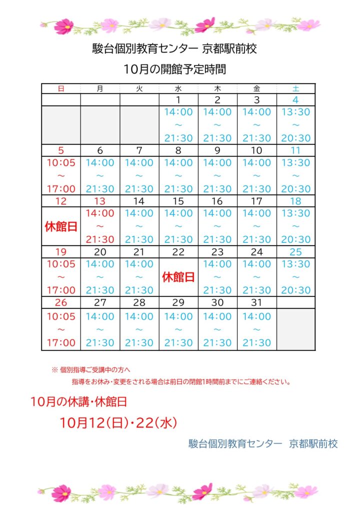 10月の開館日程 2025 9/27 京都駅前校 開館カレンダー 個別指導 大学受験 休館日10月12日(日)、10月22日(水)となります。駿台 中学部・高校生クラス・高卒クラスとは異なりますのでご注意願います。 京都駅前校 開館カレンダー 個別指導 大学受験 自習のススメ 関連記事 自習のススメ 2025年7月12日 ☆2025年度 大学合格実績☆ 2025年1月6日 駿台の個別指導を体験してみませんか? 2024年11月9日 2024年度 駿台個別教育センター 京都駅前校 合格実績 2024年3月23日 京都駅前校のご紹介 2023年12月8日 京都駅前校ってどんなところにあるの? 2023年12月8日 京都駅前校 2023年合格速報 2023年6月7日