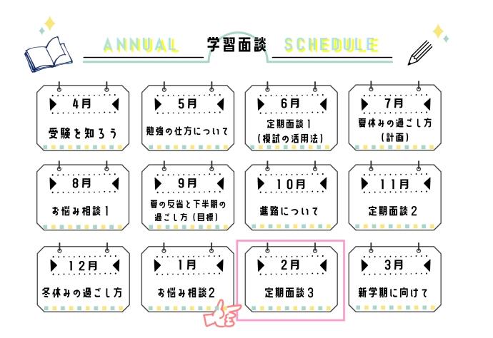 2月は個別教育センターに在籍されている個別指導生全員と学習面談を行う定期面談を実施いたします。冬休みの振り返りをはじめ、指導を実施している科目だけでなく、教科全体の学習状況のヒアリングや学習アドバイスを行います。また、学年末テストや新学期に向けた学習計画についても面談にてフォローいたします!