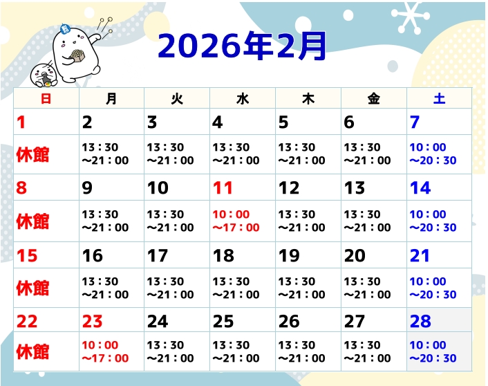 2月のルーム利用時間のご案内