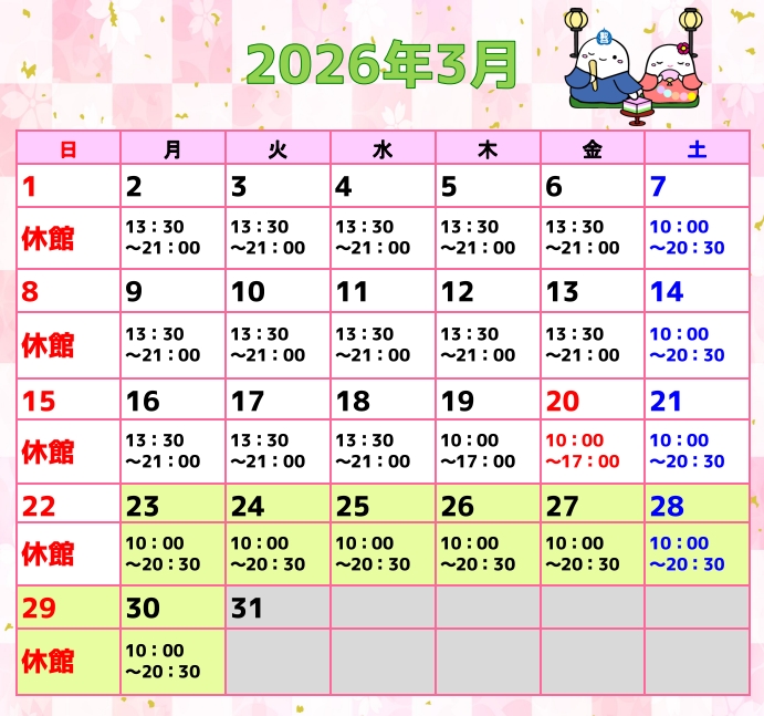 3/23(月)~4/7(火)は春期講習期間中のため開館時間が変更となります