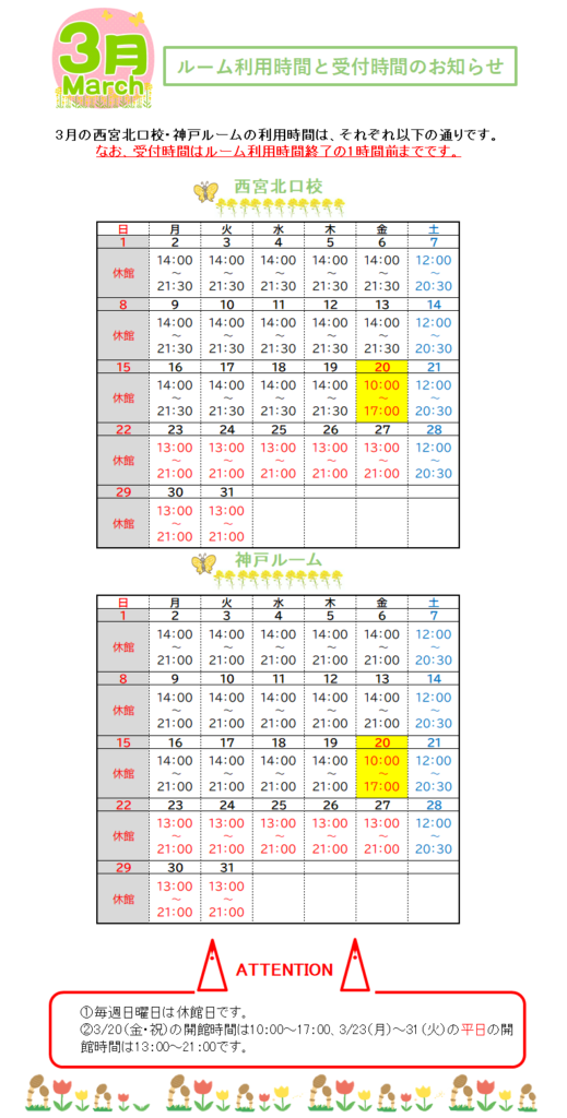 西宮北口校・神戸ルーム 3月開館時間のお知らせ