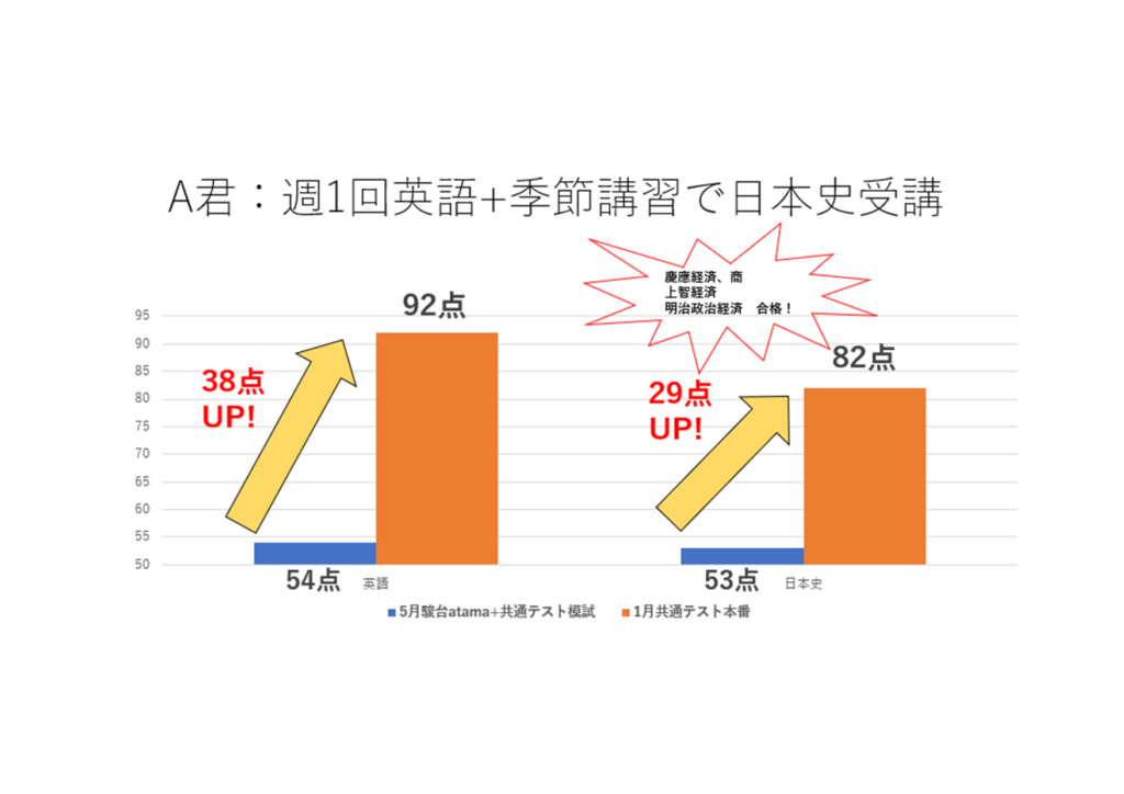 掲載した成績伸長例は、5月に実施された駿台atama+共通テスト模試の点数と2025年1月に実施された大学入試共通テスト本番の点数を比較したものです。