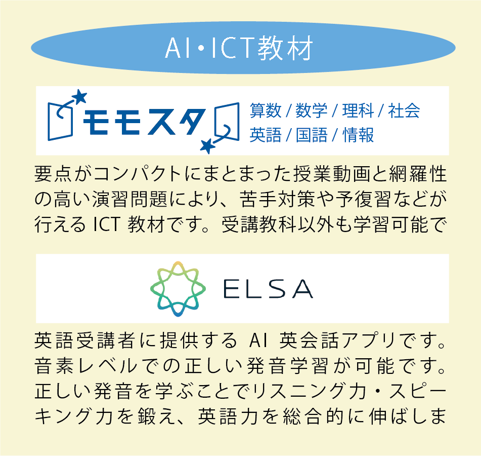 週1回(90分または120分)から受講が可能です。曜日や時間帯は学校や部活動との両立ができるよう、生徒の都合に合わせて講師を選定します。また、個別指導に加え、AI・ICT教材を使用した学習サポートを用意しています。