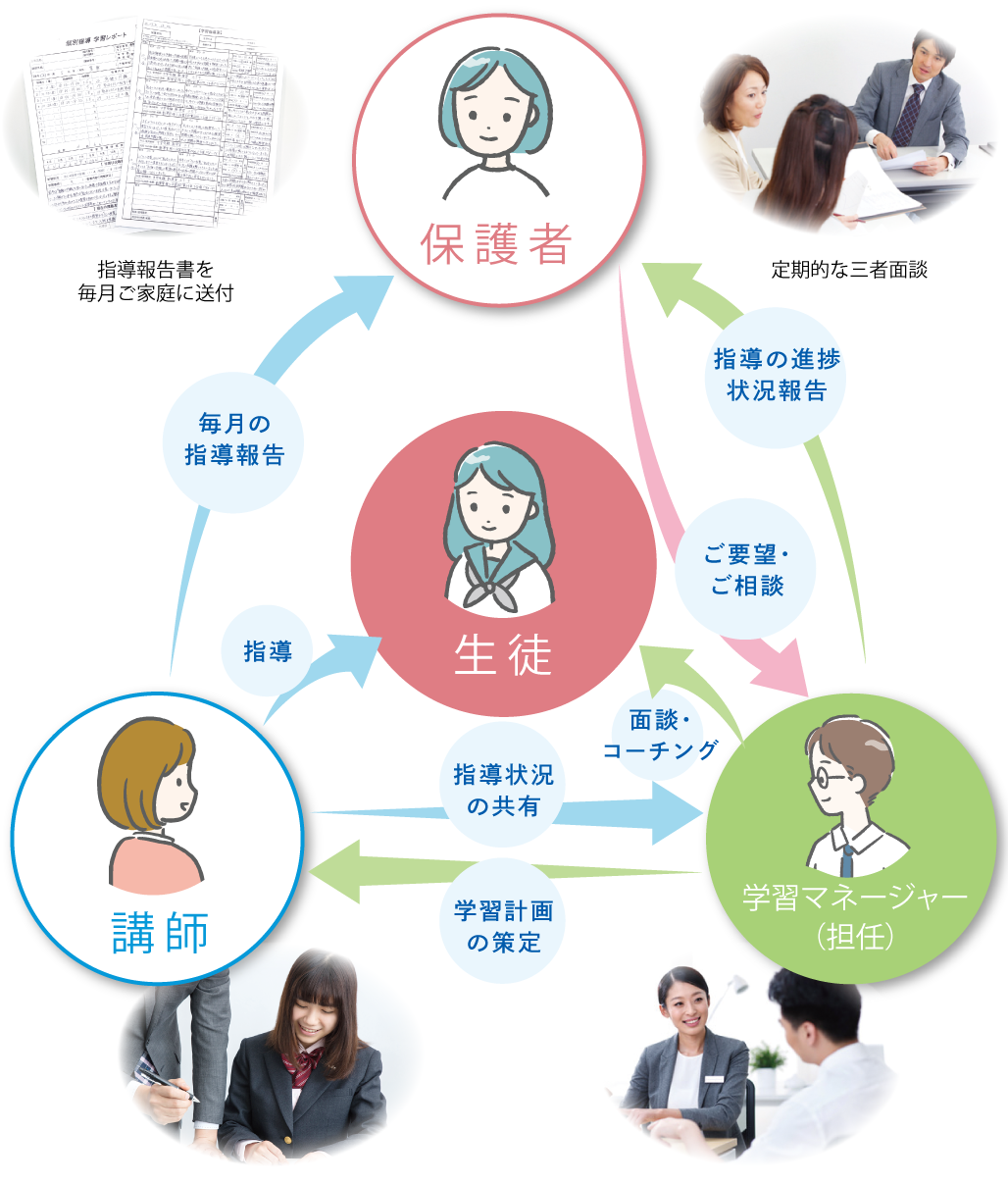 一人ひとりに進路指導担当の学習マネージャー(担任)がつき、最適なカリキュラムを提示します。それを実行する学習指導担当の講師と担任が常に状況を共有しながら、共にサポートします。