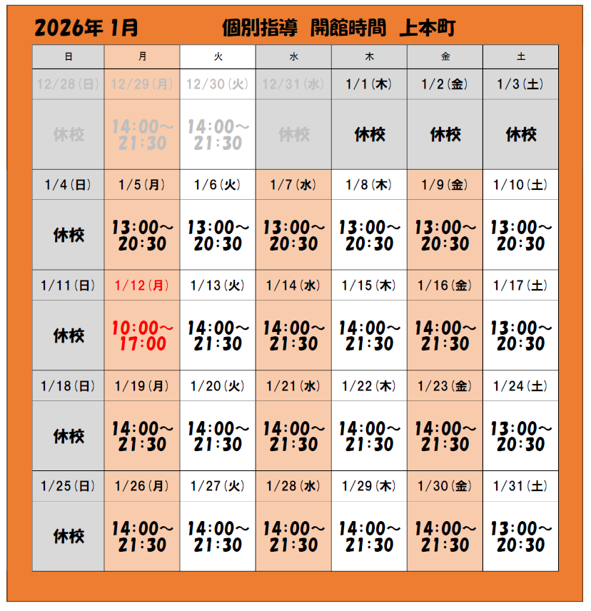 【個別指導】上本町1月開館カレンダー 2025 12/11 上本町校 自習 自習室 駿台 個別指導 塾 夏期講習 上本町校 自習 自習室 駿台 個別指導 塾 夏期講習 【個別指導】上本町12月開館カレンダー 関連記事 【個別指導】上本町12月開館カレンダー 2025年12月5日 2025年度 上本町校 合格実績 2025年7月17日 個別指導 夏期講習のご案内 2025年7月12日 体験授業 申し込み受付中! 2025年7月12日 【上本町校】体験指導のご案内 2023年6月19日